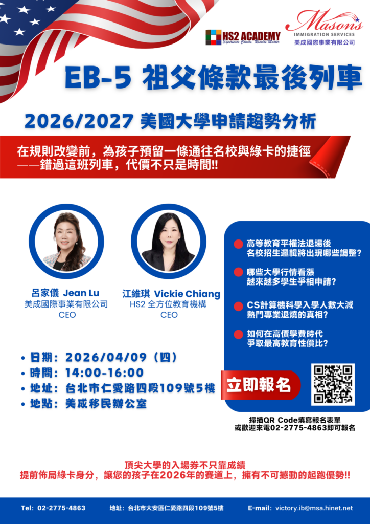 【免費講座】2026/2027 美國名校申請大洗牌!搭上 EB-5 祖父條款最後列車,為孩子拿下綠卡與名校雙重門票